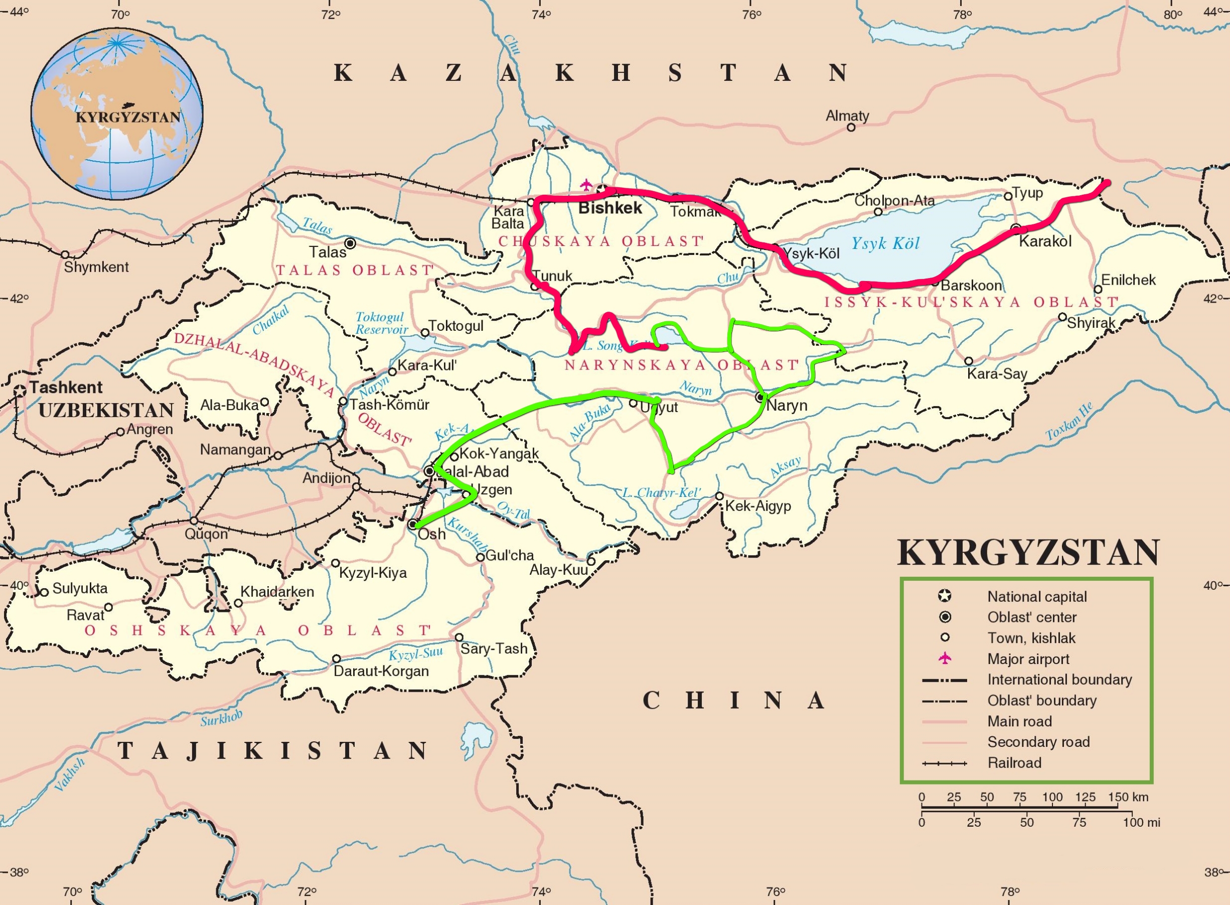 ‘Route von Song Köl nach Osh in Grün’