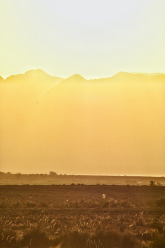 ‘Sonnenuntergang bei 40° im Altyn-Emel Nationalparkund ein Fleck auf der Linse’